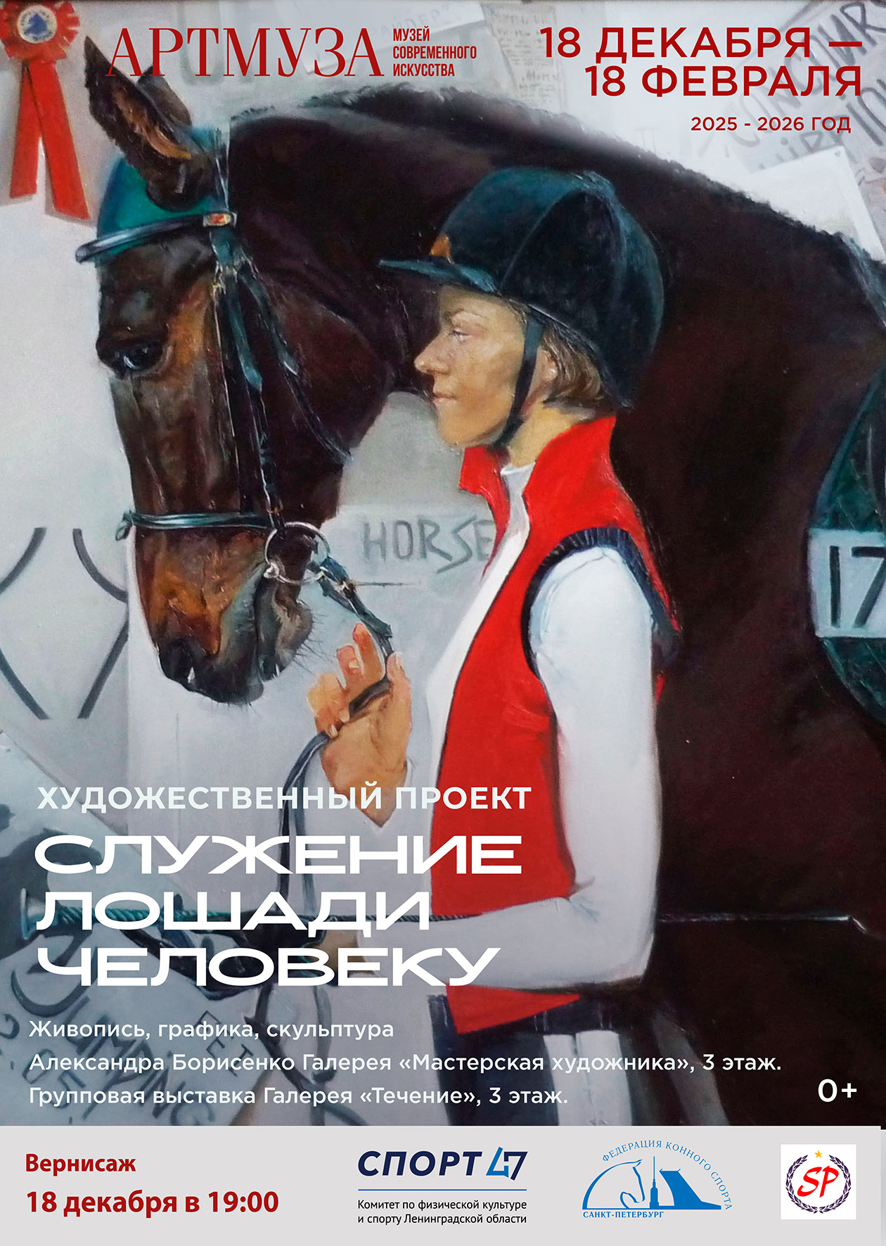 Отдельную часть проекта составляет персональная выставка художника Александры Борисенко, чьи творческие искания полностью подчинены образу коня. На ее полотнах они предстают перед зрителем по-разному — то это свободные, неоседланные лошади, устремляющие копыта в резвую рысь — то спортивные кони готовые к сложным испытаниям — бега, скачки, выездка, конкур.